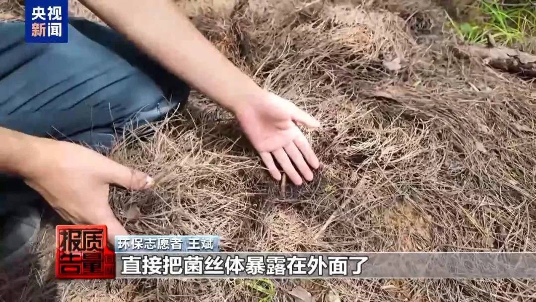 环保志愿者 王斌:耙完之后,直接把菌丝体暴露在外面了,菌丝体一见阳光之后就会死掉,就没有了日后恢复、再长蘑菇的能力了。